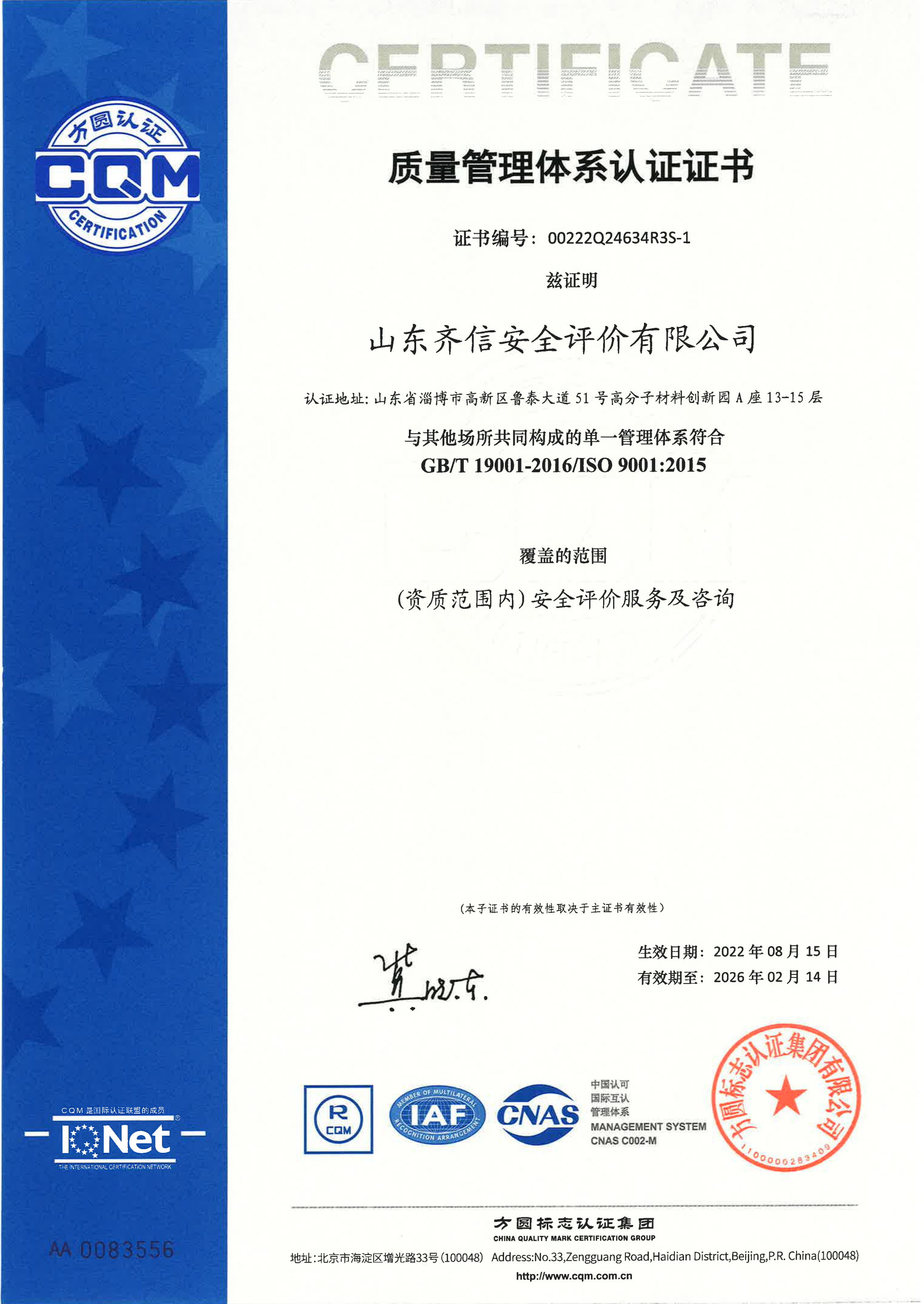 山東齊信安全評價有限公司成立于2005年3月,注冊資本300萬元人民幣,固定資產總值804.8728萬元。法定代表人徐光明,注冊地址及辦公地址位于淄博高新區魯泰大道51號高分子材料創新園A座13-15樓。2005年9月取得安全評價機構乙級資質。自國家應急部1號令實施以來,公司于2020年1月15日取得新安全評價資質,業務范圍包括:陸上油氣管道運輸業;石油加工業,化學原料、化學品及醫藥制造業;金屬冶煉。2018年12月21日取得安全生產標準化二級評審單位,評審范圍:危險化學品、紡織、建材、輕工、冶金、機械。 公司現有人員41人,其中專職安全評價師37人,注冊安全工程師26人,研究員1人、碩士5人、雙學士1人,山東省安全專家庫專家1人、教授級高工1人,高級工程師8人、工程師22人,專職危險化學品標準化評審員、工商貿標準化評審員30人,本科以上學